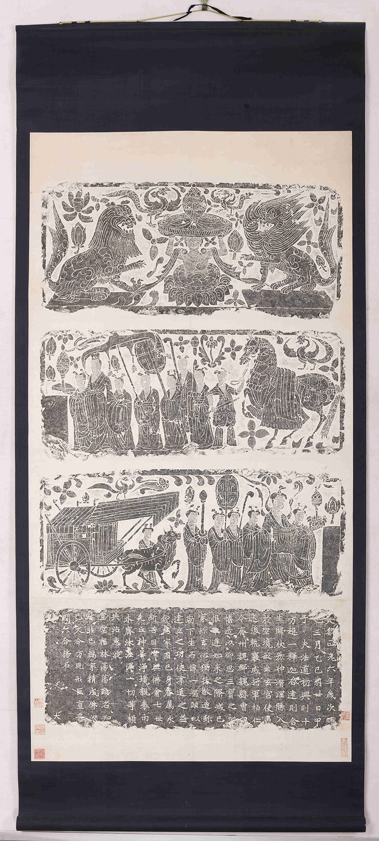 关于《曹望憘造像》的最早记载是嘉庆初年孙星衍的《寰宇访碑录》,当初是嵌在一村舍壁上,应只露文字一面,故早期拓本只有文字而无造像,阮元《山左金石志》、汪鋆《十二砚斋金石过眼录》等也只是对字体多有赞扬。一种可能是嵌于壁间,其他三面不得传拓,故诸家只见文字;还有一种可能是早期金石学家只重文字,并不重视画像,如同武梁祠在乾嘉之际只拓文字、不拓画像的情况。直至此石为陈介祺所收,才有四面完整的拓本。未归陈氏前,拓工一般,归陈氏则精拓,浮雕人物脸部用淡墨拓出,其他部分用浓墨,使拓本更有立体感,石上鱼籽纹分明,狮子鬃鬣飞扬,天女优美,供养主神情肃穆、仪态庄静,可称是石刻画像中的上品,被世人所珍视。