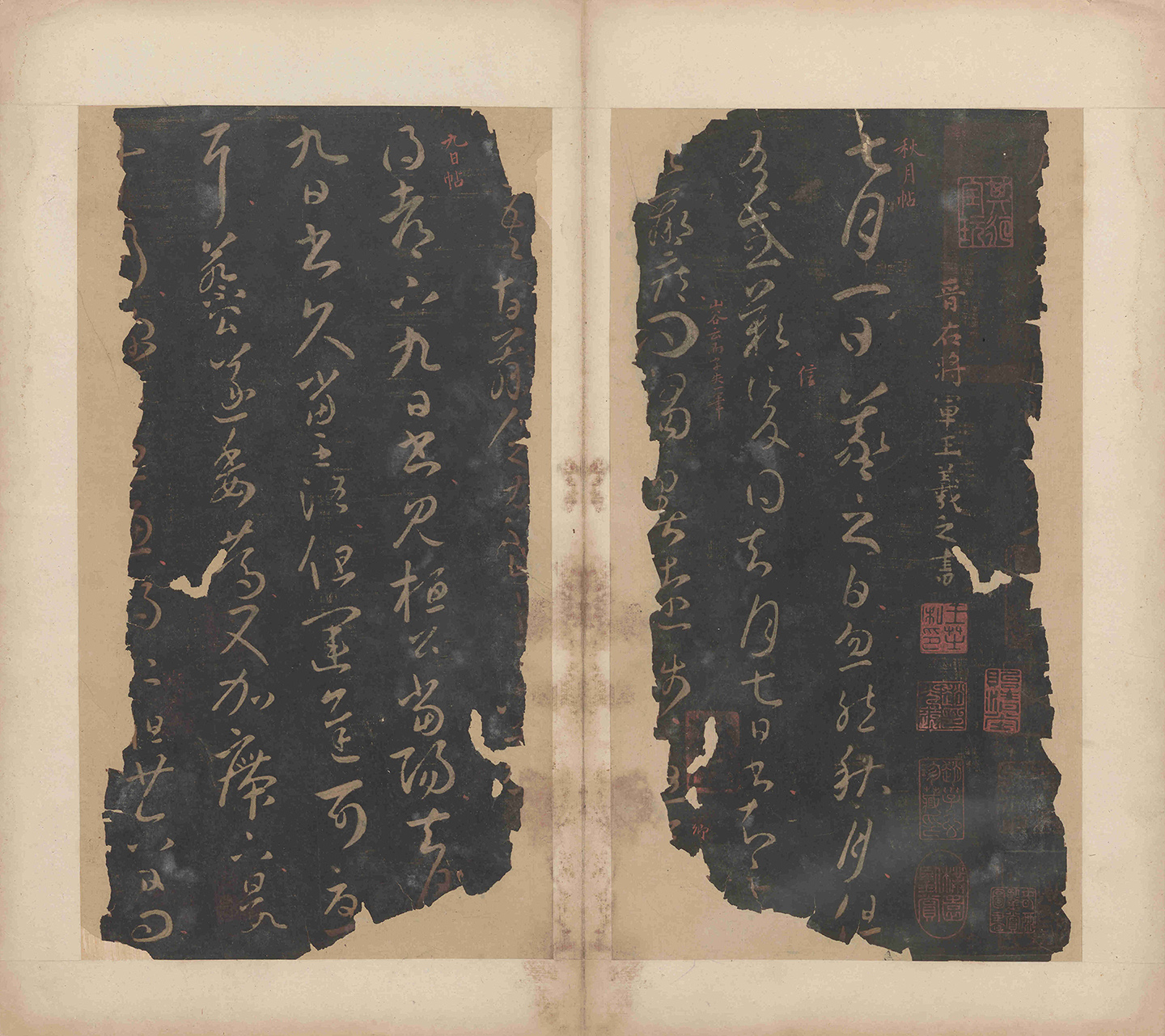 现存世《大观帖》第八卷宋拓本仅有清代海源阁藏浓墨拓本,现藏于故宫博物院。经对比发现,首先,第八卷帖首“历代名臣法帖”“法帖”下应有“第八”二字,故宫本已被抹去,而馆藏本《大观帖》第八卷帖首“历代名臣法帖第八”八字俱全。从字体看,馆藏本第八卷帖首小行书,较之故宫本帖首小楷书,圆笔更多,帖首第二行“晋右将军王羲之书”首字位置较“故宫本”略低,另第八卷内有佚名朱批“邢子云二帖王著伪迹”“清和帖”“此帖右军真书神品”“乡里帖”“发虐帖”“狼毒帖”“腹痛帖”“感怀帖”“邛竹杖执手帖”“以上二十六帖皆真书”“蒸湿帖”“原以此帖为唐人书,愚以为右军笔”“喜慰帖”“采菊帖”“伦等帖”“知彼独生帖”“邢子原以为王著书,愚以为以上皆右军书”“安西帖”“黄甘帖”“雨快帖”“遣书帖”“此郡帖”“以上皆右军真书神品”。第八卷有帖尾“大观三年正月一日奉圣旨摹勒上石”。馆藏本《大观帖》惜仅存遭火之后的残余,以第八卷内容较多。幸有良工装裱保存下来,经多次比对,此《大观帖》拓本传拓时间应该不晚于明代,字口清晰,墨气精佳,更因保存了王羲之的大部分帖目,有着独特的研究价值和版本价值。