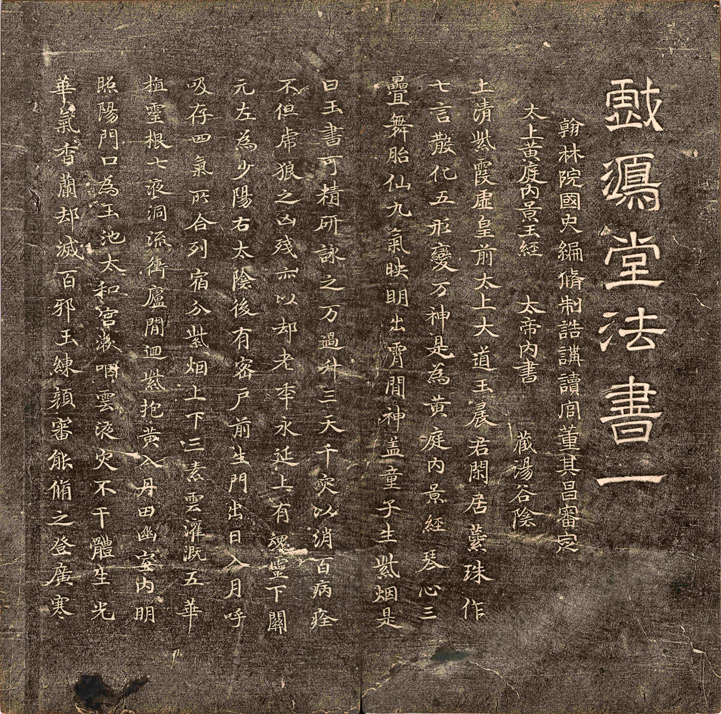 《戏鸿堂法帖》于明万历三十一年(1603) 刻,华亭董其昌辑并摹勒,凡十六卷。选自晋唐宋元诸家法书,帖名取自南朝梁袁昂《古今书评》“钟繇书意气密丽,若飞鸿戏海,舞鹤游天” 。帖石经施叔灏、王鸿绪等人递藏,抗日战争期间有毁损,残石现藏于安徽省博物馆。