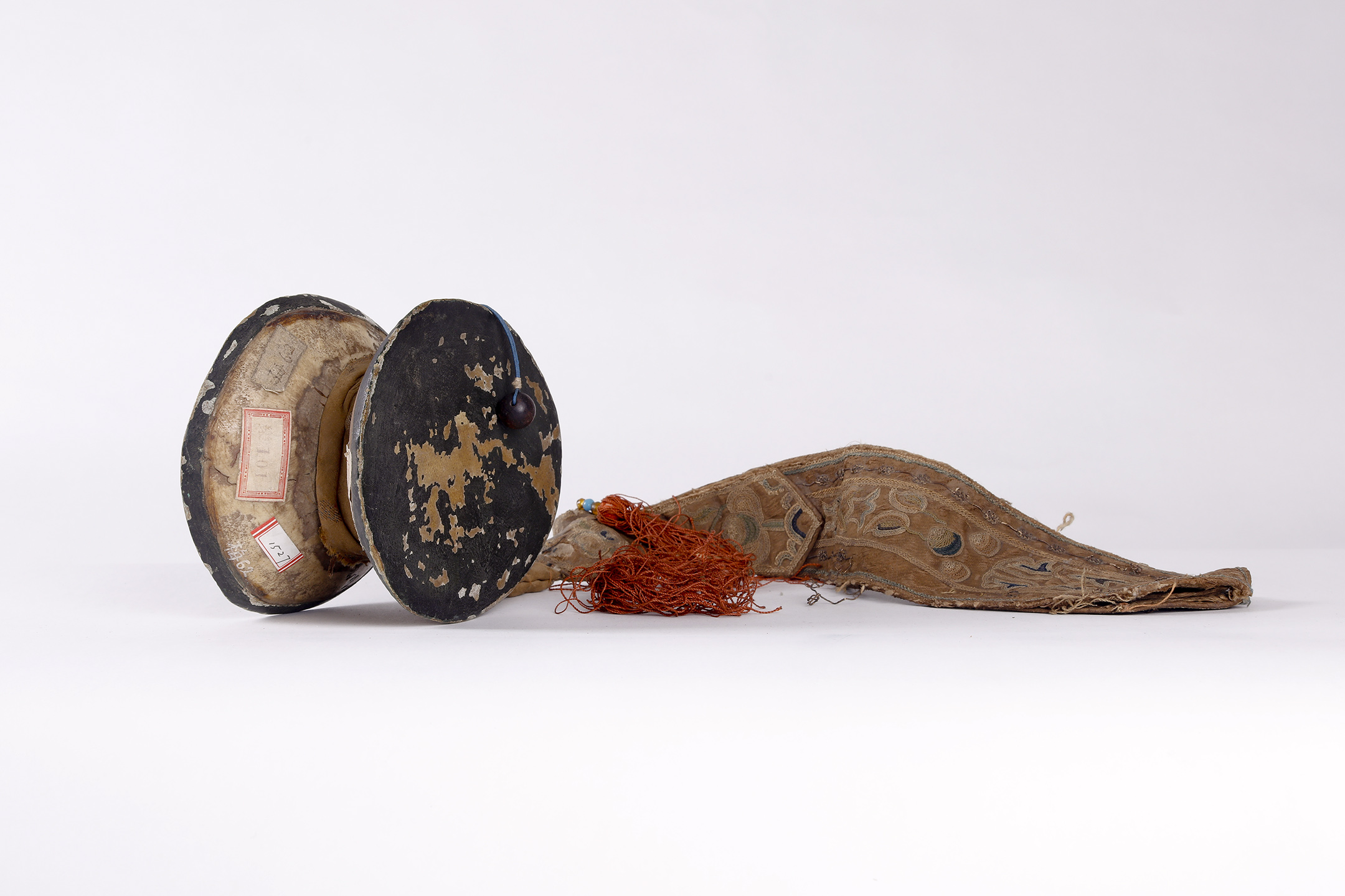 此次展出2件达玛如。其中一件为人头骨制鼓腔,两面蒙山羊皮。鼓腔对称的两侧各系一绒布细绳,其尽端有球形硬质小鼓坠。鼓腔中腰缠绕布圈,并拴系彩穗为饰。通高8.5厘米,鼓面径12厘米。此器为梅兰芳旧藏,1958年入藏我院。另一件为硬木制鼓腔,两面蒙人皮。对称的两侧各系一绒布细绳,其尽端有球形硬质小鼓坠。鼓腔中腰缠绕布圈,并拴系彩缎、丝穗为饰。通高9.7厘米,鼓面径12.3厘米。