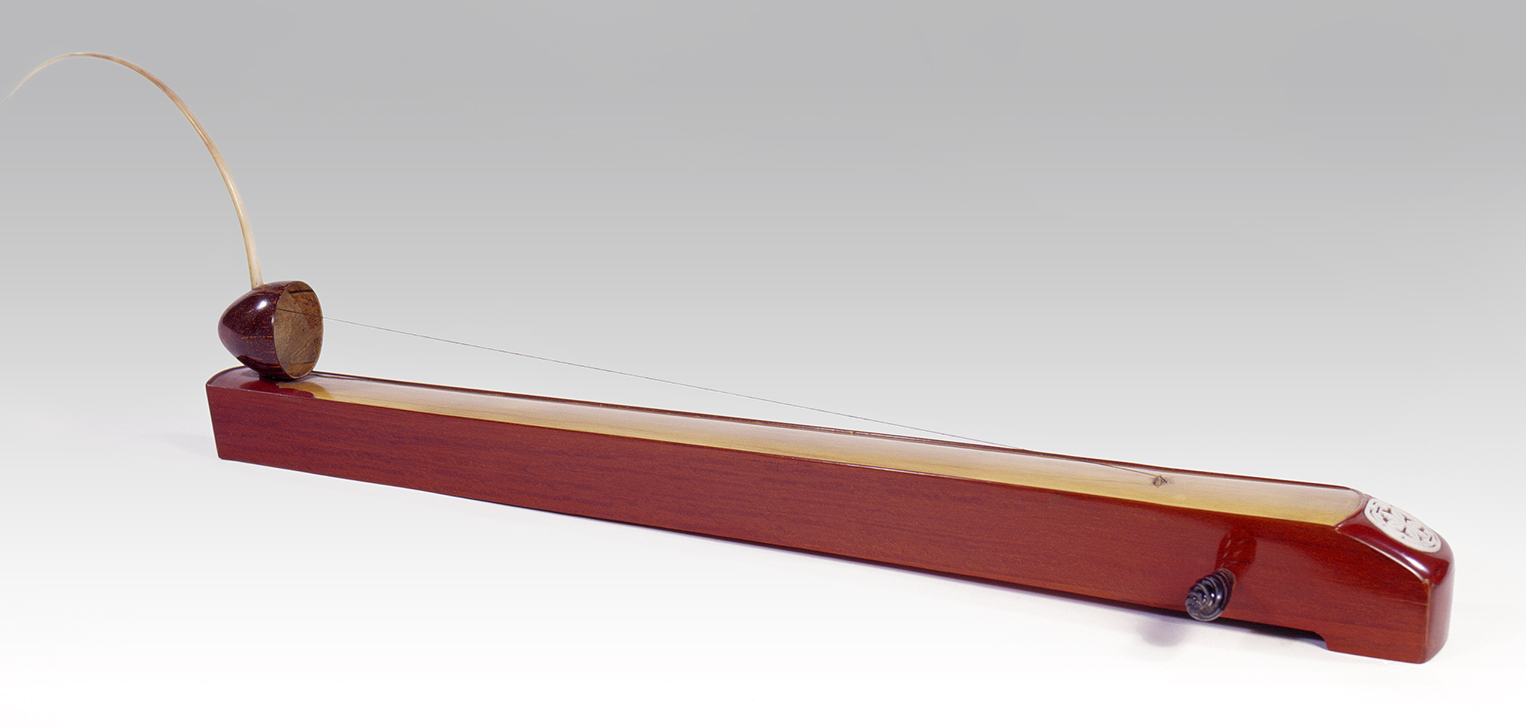 独弦琴,京族弦鸣乐器,京语称“旦匏”,流行于广西壮族自治区一带,广泛用于京族的节庆活动中或农闲时。演奏时,右手执竹制挑棒挑拨琴弦,左手握住摇杆,通过推、拉改变弦的张力来调整音高。独弦琴是泛音演奏乐器,其演奏手法独特,可在一条弦上同时奏出两个音,音色优美柔和。