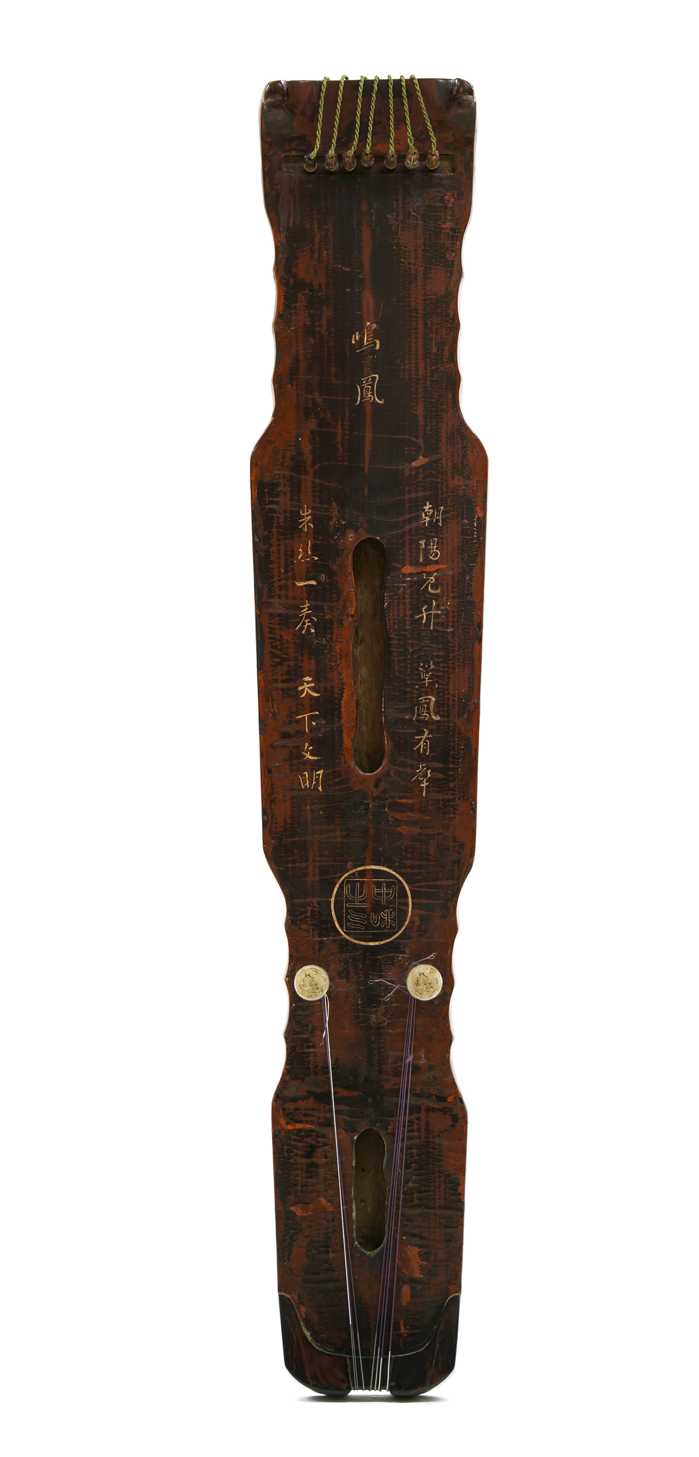 南宋,连珠式变体。桐木斫,原髹黑漆,后以栗壳色漆与朱漆修补,鹿角灰胎较薄,底有八宝灰胎,为管平湖修补。琴面呈大小蛇腹间牛毛断纹,琴底断纹不甚规则。钧瓷徽(一说琉璃徽),亦为管氏所补。红木岳山,木轸,玉足,足底刻龙一对,足侧面刻螭龙,疑为明代所加。此琴面宽而扁,项、腰作连续四弧,龙池、与凤沼均作三连弧形,池内纳音微隆。琴额镶椭圆形水鸟纹和田青白玉雕配饰,上刻荷花、荷叶图案。龙池上方刻楷书“鸣凤”琴名,池旁刻行书“朝阳既升,巢凤有声。朱丝一奏,天下文明”池下近足处刻双钩篆书“中和之气”圆印。通长126.5厘米,隐间115厘米,额宽20厘米,肩宽23厘米,尾宽17厘米,厚6.3厘米。原为管平湖所有,并加以重修。后管氏将此琴与山东琴家之琴交换,20世纪50年代复经管氏寻求,为音乐研究所购得。